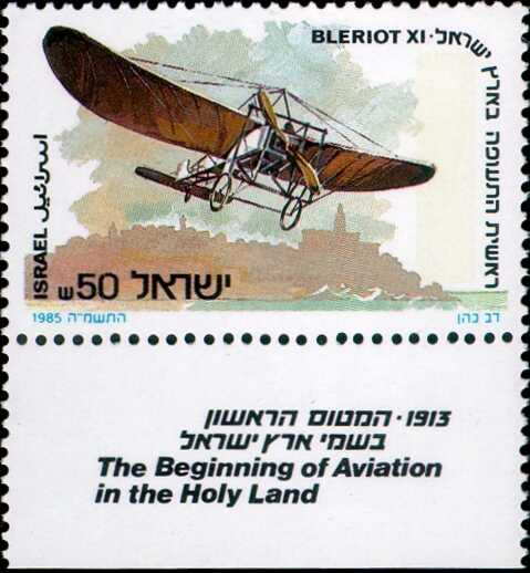 במרוץ מפריז לקהיר ב־1913 נקבעו תחנות ביניים ביפו ובירושלים. מטוסו של ודרין על רקע יפו, מתוך סדרת הבולים ׳ראשית התעופה בארץ ישראל׳ בעיצובו של דב כהן, 1985 | התאחדות בולאי ישראל