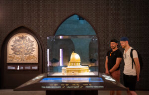 Each room also reproduces a classic work of art central to the religion in question’s relationship with Jerusalem. Electronic effects allow interaction with each work, be it the Madaba Map, for example, which pinpoints the Holy Land’s Christian sites, or the Arch of Titus, depicting the Judean exiles’ march to Rome in chains, clutching the spoils of Jerusalem, including the Temple candelabra. The reproduction reflects Yeshiva University research into the arch’s original colors. Pigment slowly spreads across the relief’s white, marble figures, until they appear more or less as they did in ancient Rome. (The vivid, somewhat garish shades identified by scholars have been toned down for today’s sophisticated tourists).