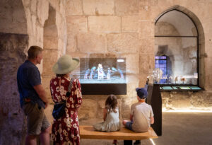 As one opens the heavy, wooden door into the museum’s dark entrance hall, a freestanding wall of sophisticated touch screens introduces the history of Jerusalem. This state-of-the-art technology contrasts sharply with the sense of being inside an ancient fortress, its thick walls arching to a high ceiling against which dim lighting brackets create a torchlit effect. The tower itself is clearly now the main focus of the museum’s story, the inescapable prism through which Jerusalem is framed.