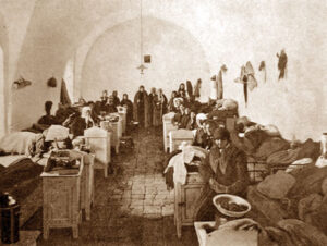 The average tourist would definitely wrinkle his nose in disgust and pity at the row of old women beaming from the photo of the Russian Compound’s pilgrim hostel in turn-of-the-century Jerusalem. The subjects are seated on iron bedsteads on a flagged floor in a muddle of nondescript bureaus and rags. What stranger can appreciate a pilgrim’s joy at journey’s end, the expense and uncertainty all behind him, and only the calm and quiet of the Church of the Holy Sepulchre ahead? Who cared about the standard of accommodation when it came gratis in the Russian Compound, with a premium breakfast and the dust of saints thrown in?